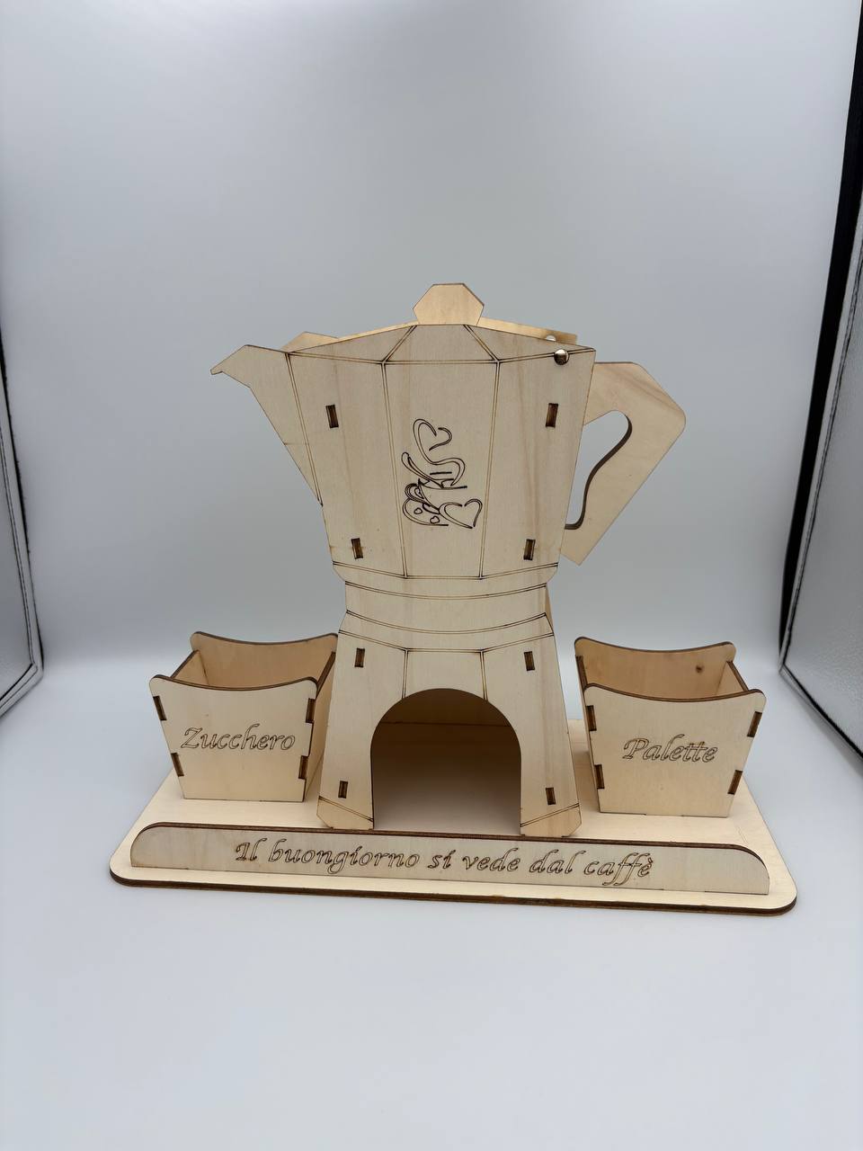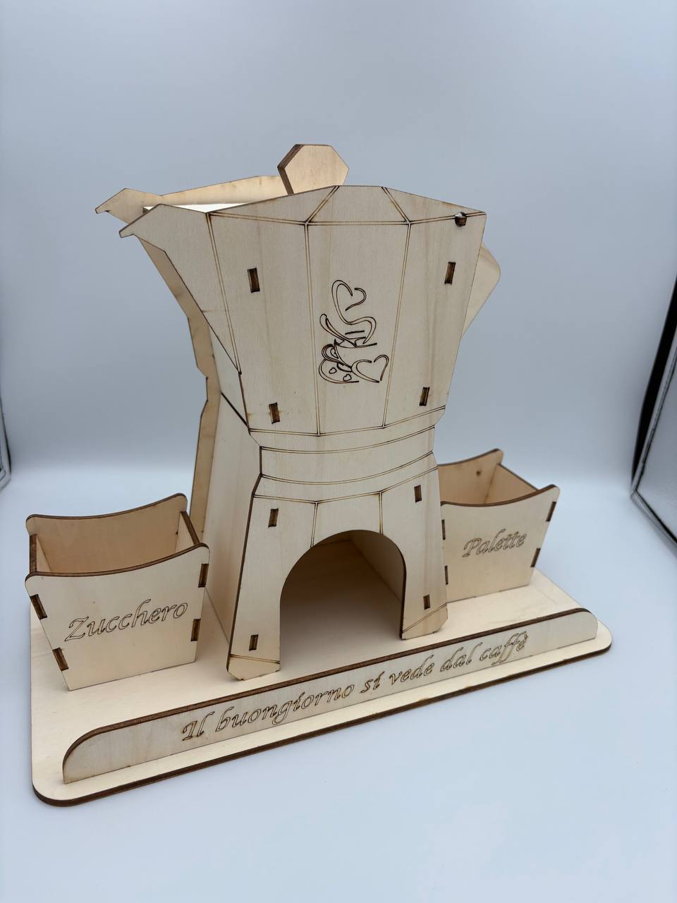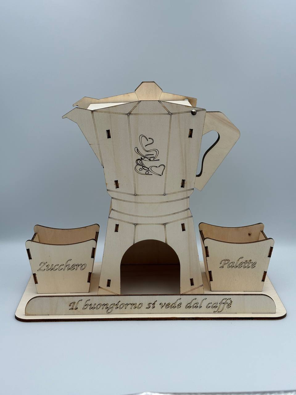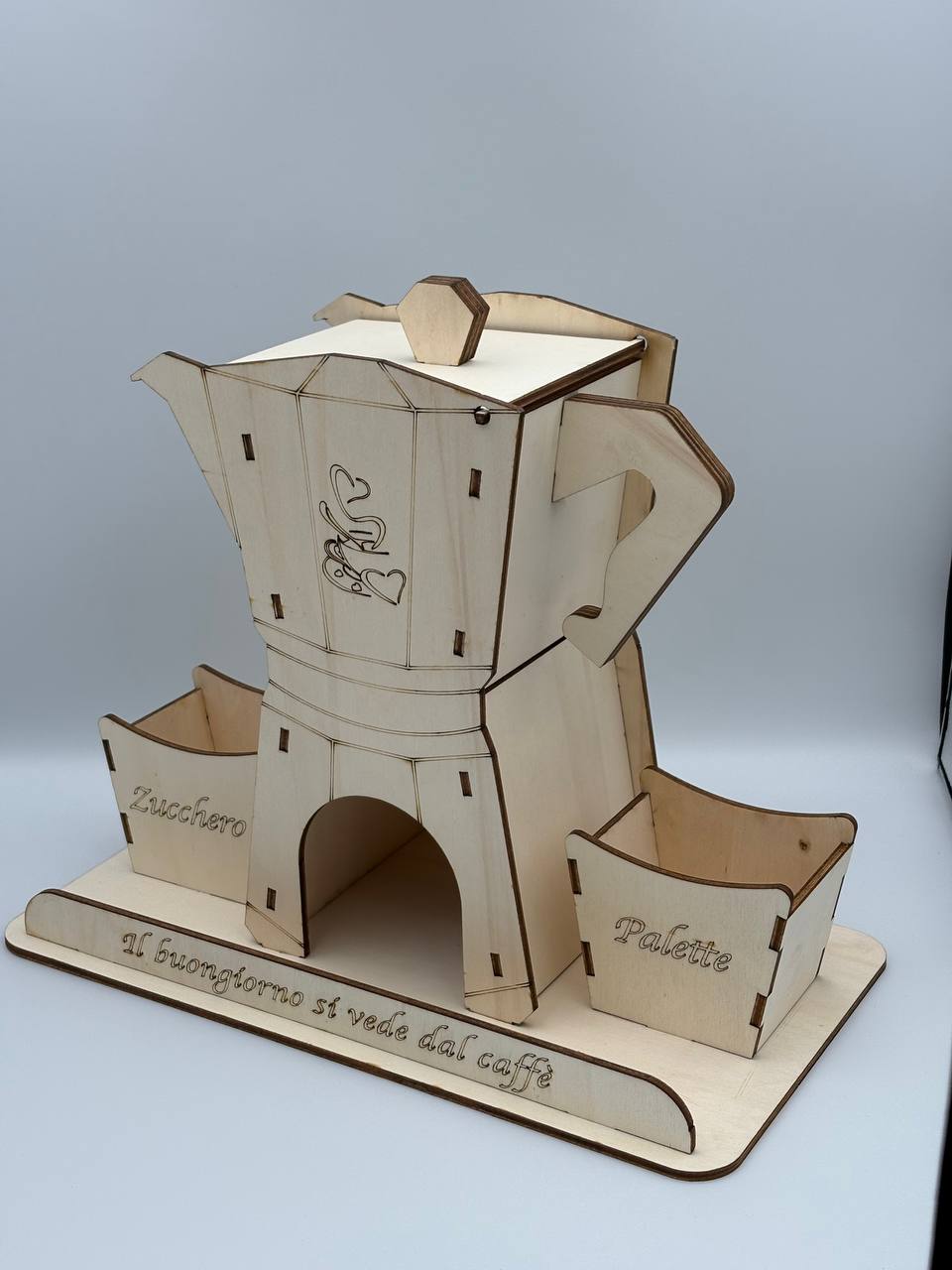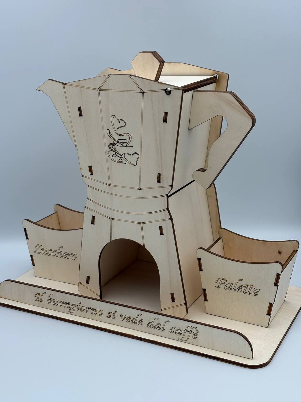 Porta stile e ordine nell’angolo caffè, l’elegante organizer in legno che richiama la forma iconica della moka italiana. Un oggetto funzionale e decorativo, ideale per tenere sempre a portata di mano capsule, zucchero e palettine.