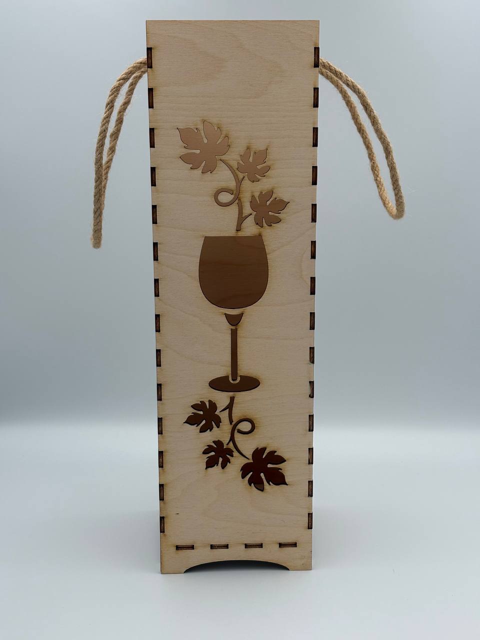 Scatola porta bottiglia in legno calice e foglie d’uva – Con manico in corda