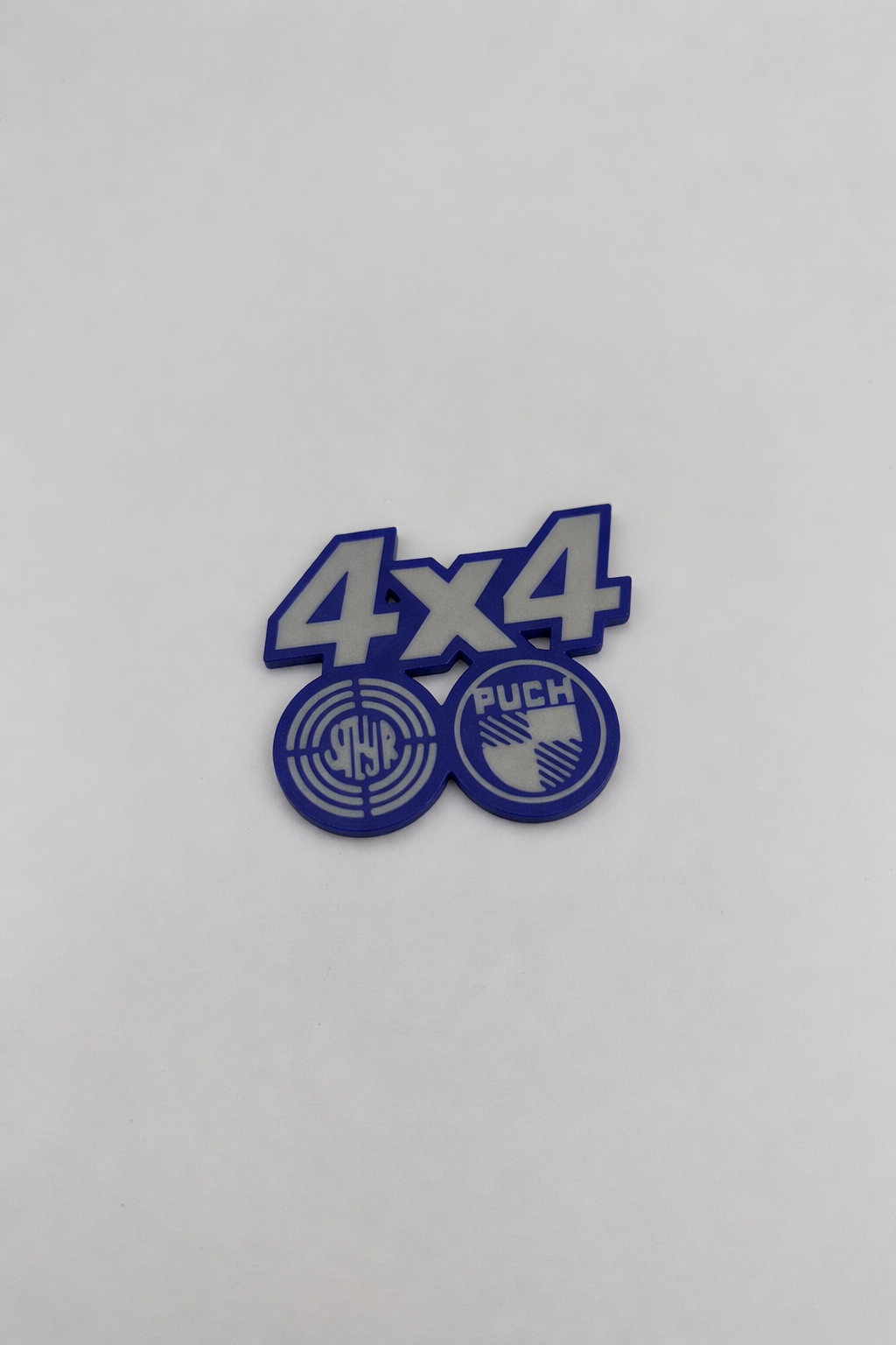 Replica del logo/emblema “Steyr Puch” per Fiat Panda 141 4×4, progettata per sostituire o personalizzare il logo originale presente sul portellone posteriore dell’auto classica.
